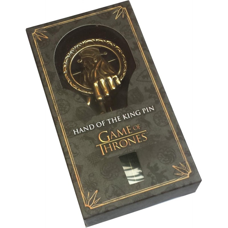 Cette broche impressionnante, symbole emblématique de Game of Thrones, représente la célèbre Main du Roi. Fabriquée par The Noble Collection, elle présente une finition dorée vieillie, lui conférant un aspect authentique et majestueux. Mesurant 15cm x 8cm x 3cm, c'est une pièce robuste et détaillée, parfaite pour les collectionneurs ou ceux qui cherchent un cadeau spécial. Cet article sous licence officielle capture l'essence de la série dans chaque détail, du design complexe de l'anneau à la forme réaliste de la main. Idéal pour les événements thématiques ou pour décorer un espace dédié à la série. Ne manquez pas la chance de posséder ce symbole extraordinaire de pouvoir et de loyauté à Westeros.