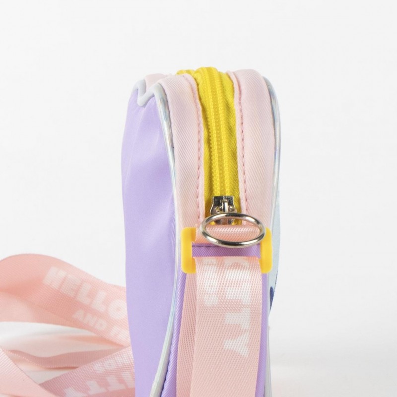 La fermeture éclair jaune assure la sécurité de vos affaires, tandis que la bandoulière ajustable avec le texte 'Hello Kitty and Friends' ajoute une touche personnalisée et confortable. Le sac offre suffisamment d'espace pour ranger les essentiels de tout jeune fan.