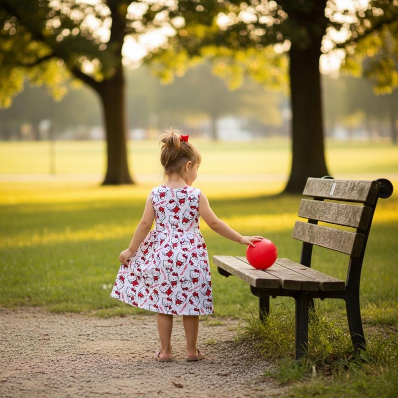 Cette charmante robe en coton Hello Kitty est idéale pour les jeunes fans du personnage emblématique. Fabriquée à 100% en coton, elle assure confort et fraîcheur, parfaite pour les journées de jeu et d'aventure. Le design présente un fond blanc orné de nombreux imprimés Hello Kitty en rouge et noir, rendant cette robe amusante et élégante.
