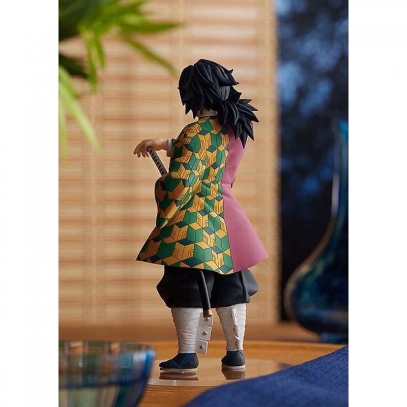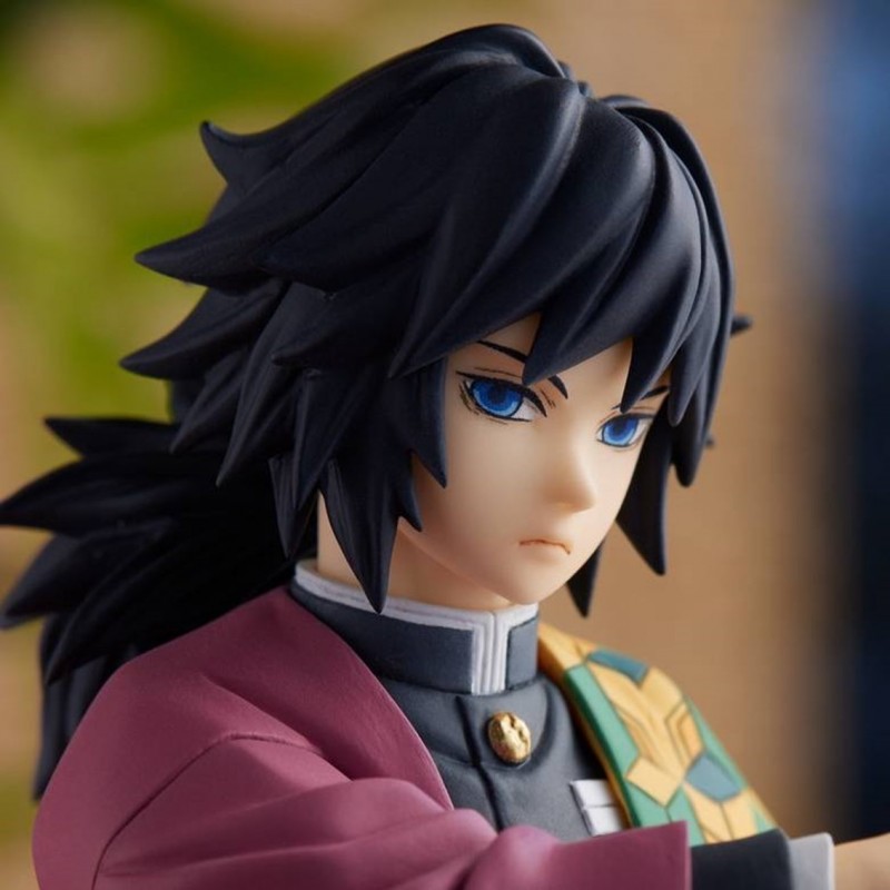 Giyu porte son uniforme noir caractéristique, avec un haori dans des tons violets et des motifs géométriques verts et oranges. L'attention aux détails s'étend à son expression sérieuse et à son épée soigneusement sculptée, capturant l'essence du personnage. Ce produit sous licence officielle est parfait comme cadeau ou pour se faire plaisir.
