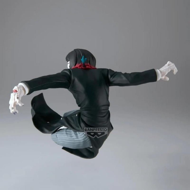 La figurine capture Enmu dans une pose dynamique et pleine d'action, mettant en valeur son costume noir avec des accents rouges et bleus qui ajoutent une touche distinctive. La finition de qualité reflète la réputation de Banpresto pour créer des produits sous licence officielle très reconnus.