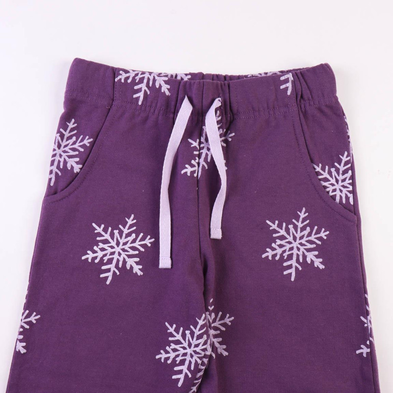 Le pantalon est violet avec une ceinture réglable et des flocons de neige amusants.