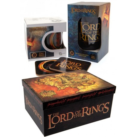 Dans une boîte de carton et d'un grand dessein, qui a été spécialement conçu pour ce cadeau et correctement étiquetés avec les couleurs de la légendaire film, vous trouverez une tasse en céramique de 300 ml officiel de la saga, un verre d'une pinte de demi-litre de capacité en noir avec le logo du film et un couple de sous-verres en liège avec des motifs de le Seigneur des Anneaux.