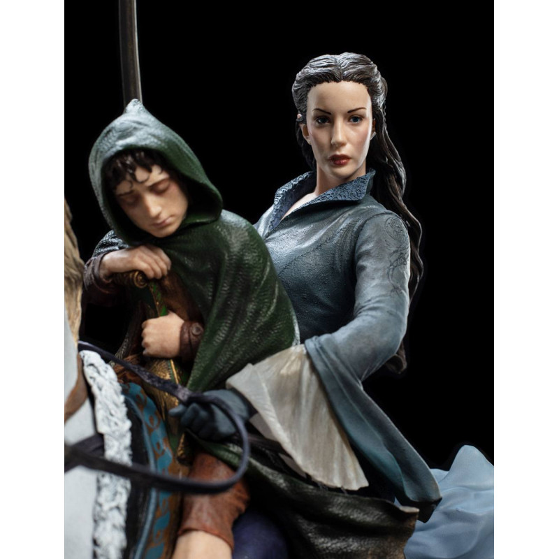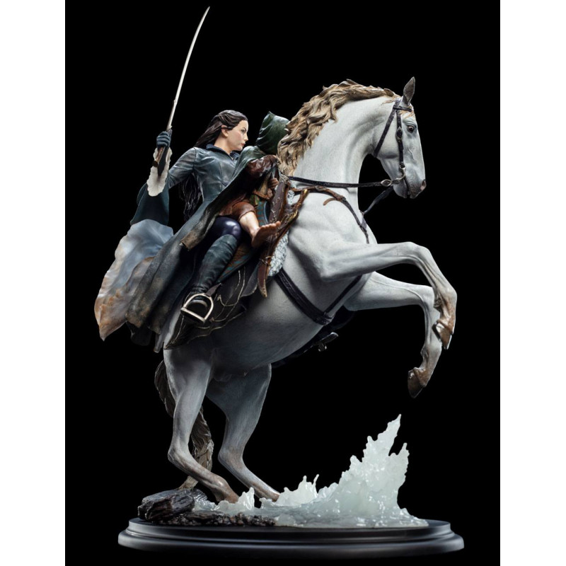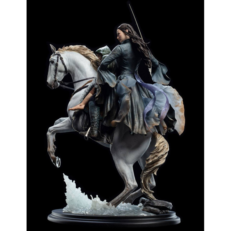 Cette statue de la prestigieuse marque de WETA Collectibles semble prises directement à partir de la superficie de le Seigneur des Anneaux. Fini et peint à la main, présente quelques-uns des détails qui vous laissera bouche bée: Le regard et les gestes de la tension d' Arwen et le cheval Asfaloth, le visage hagard de Frodon par la plaie de la dague Nazgul à partir du haut de la vents, chaque texture des différents tissus des vêtements qu'ils portent et même l'eau de la rivière. Ne manquez pas de regarder les photos pour apprécier ces et plus de détails.