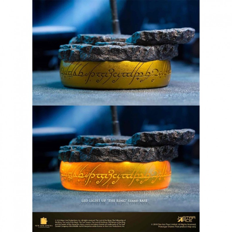 La figurine peinte à la main garantit une qualité maximale et est accompagnée de nombreux accessoires pour améliorer son exposition. Un des points forts est la base lumineuse, conçue avec le texte de l'Anneau Unique, qui ajoute une touche unique et magique.