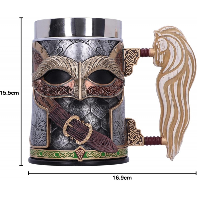 Cette chope de bière Rohan de 15,5 cm est un véritable hommage aux fans de la célèbre saga. Fabriquée par NEMESIS NOW, elle est sous licence officielle, garantissant qualité et authenticité dans chaque détail. Le design est inspiré par les éléments caractéristiques de Rohan, avec une finition métallique qui imite l'apparence d'une armure. La chope présente des décorations complexes et une poignée en forme de cheval de style elfique qui complète son esthétique médiévale. Parfaite pour ceux qui recherchent un cadeau original ou un plaisir spécial pour eux-mêmes.