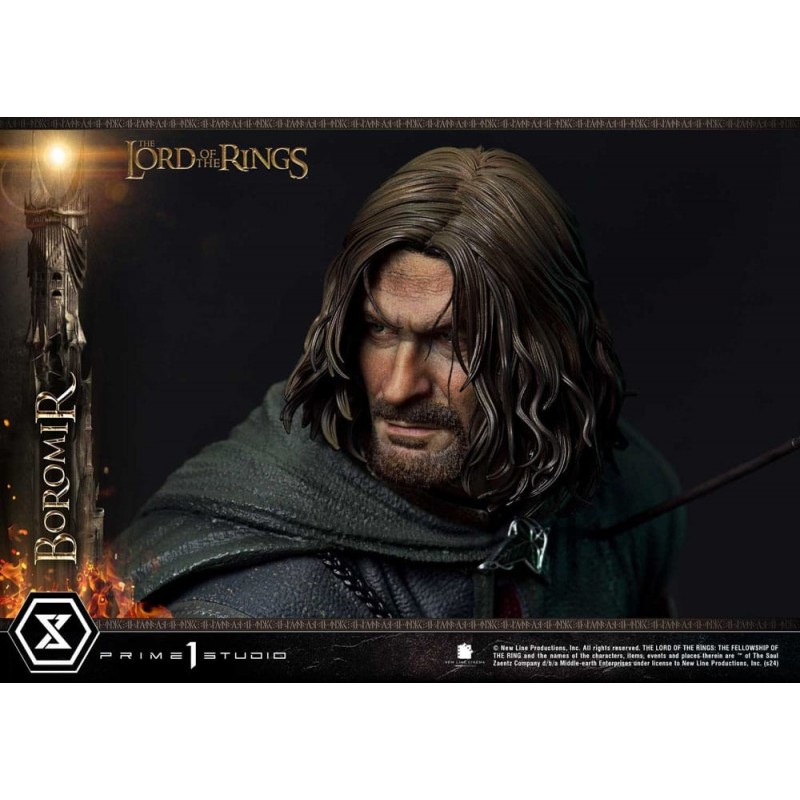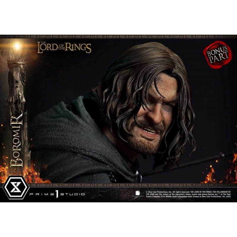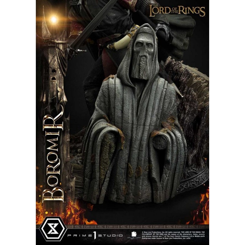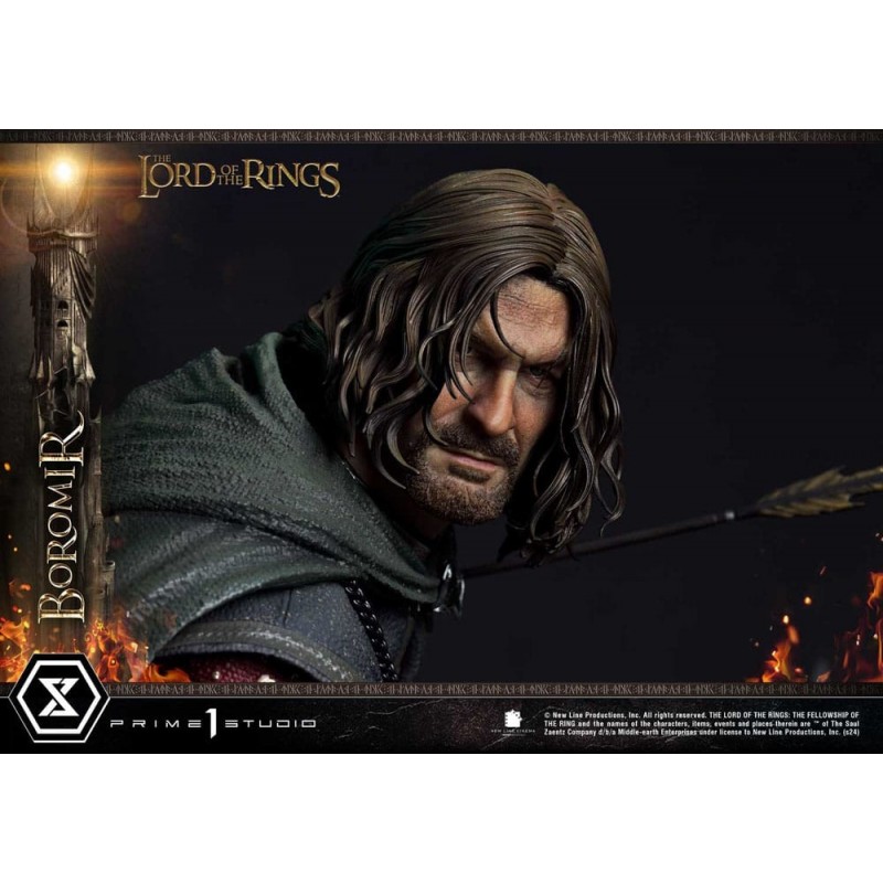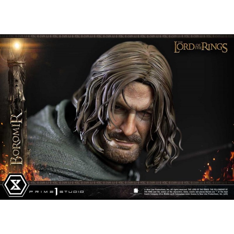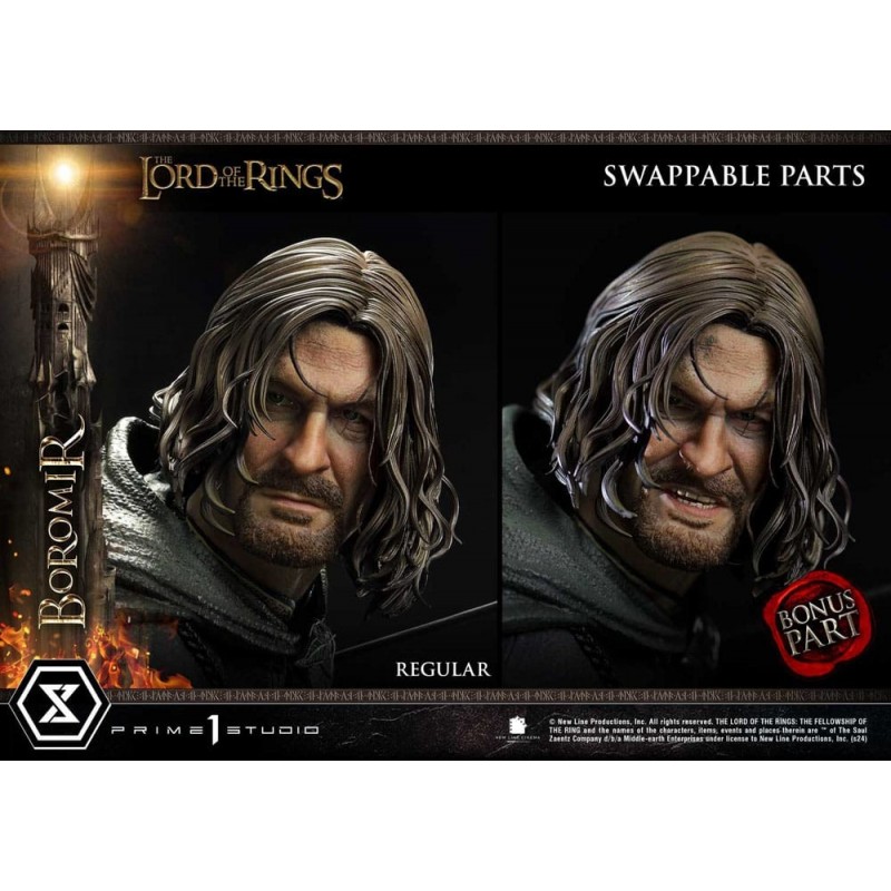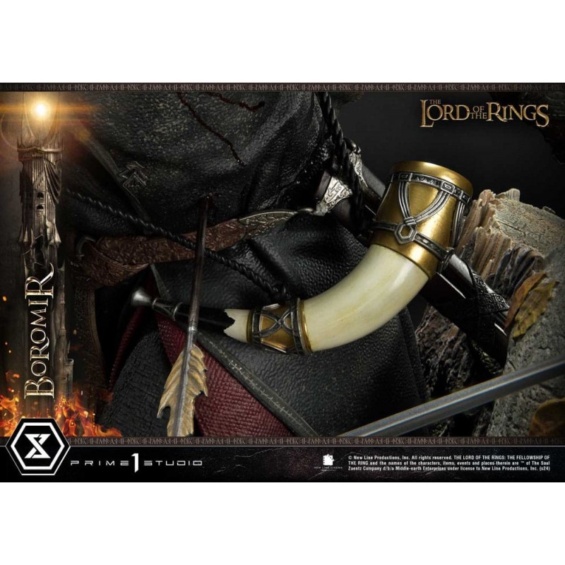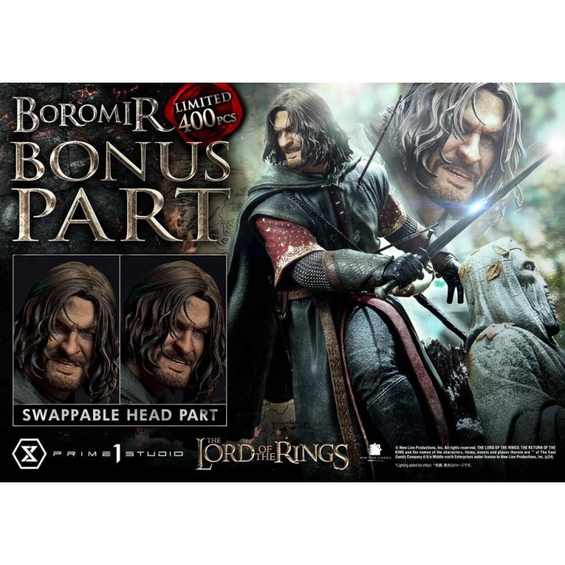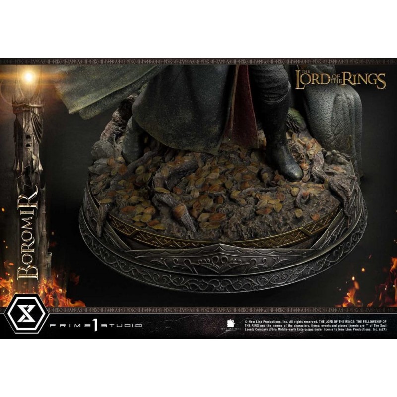 La base de la statue est ornée d'éléments évoquant la Terre du Milieu, ce qui en fait une pièce d'exposition impressionnante. De plus, cette version inclut une tête interchangeable montrant Boromir dans un moment d'émotion intense, ajoutant de la polyvalence à la pièce.
