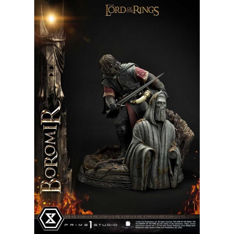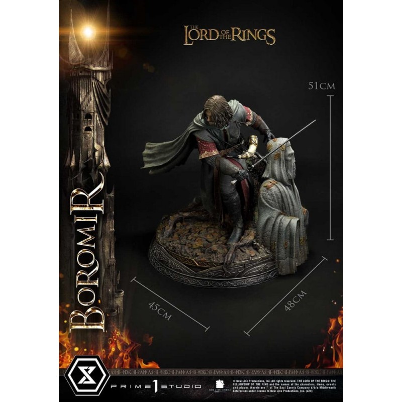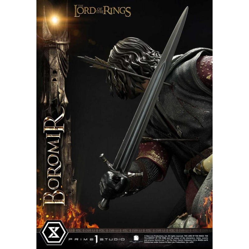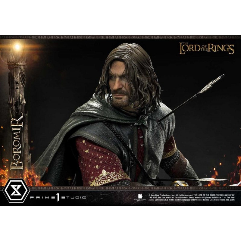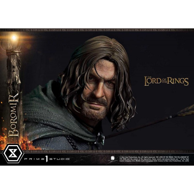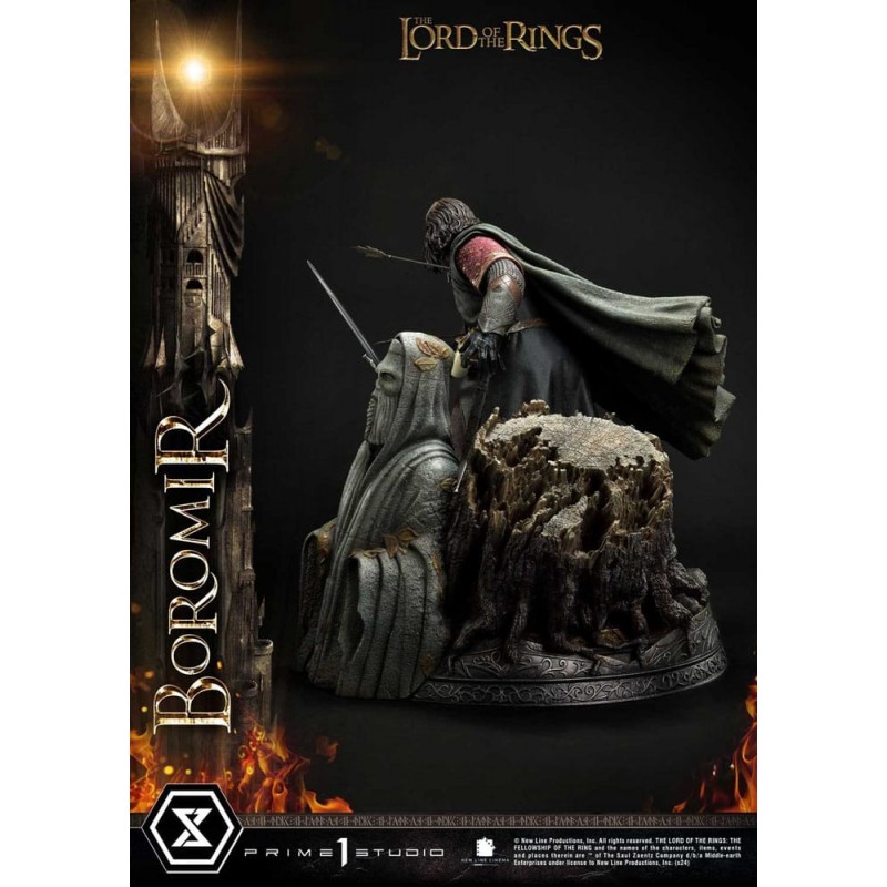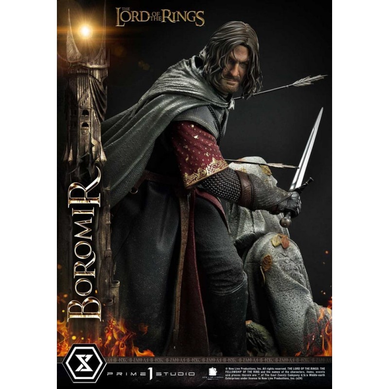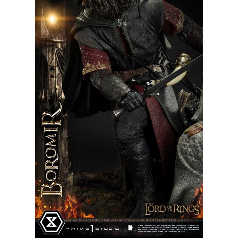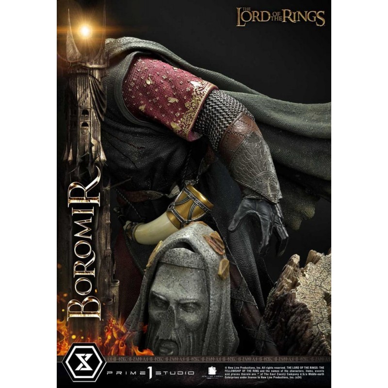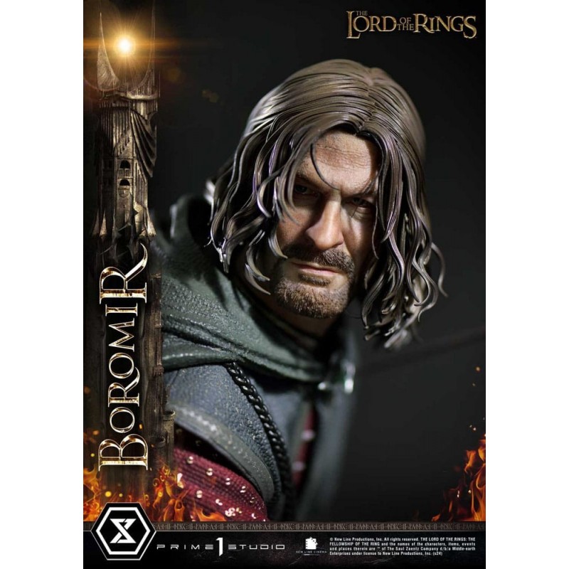 La base de la statue est ornée d'éléments évoquant la Terre du Milieu, ce qui en fait une pièce d'exposition impressionnante. De plus, cette version inclut une tête interchangeable montrant Boromir dans un moment d'émotion intense, ajoutant de la polyvalence à la pièce.