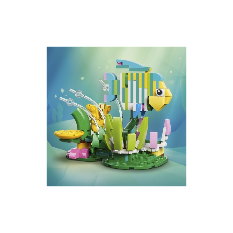 Le modèle principal présente un colibri aux couleurs vives comme le rose, le bleu, le vert et le jaune, se nourrissant d'une fleur. Les pièces articulées permettent de positionner les ailes et les nageoires, ajoutant du dynamisme à chaque création. Les alternatives incluent des modèles de papillon posé sur une fleur et de poisson nageant parmi les algues.