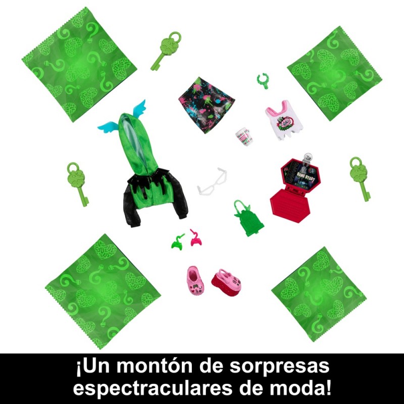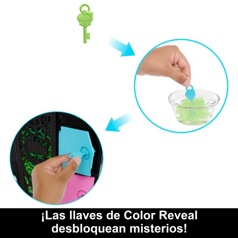 Profitez d'une expérience de déballage unique grâce à la magie Color Reveal et ses quatre clés mystérieuses, déverrouillant des compartiments remplis de surprises allant des articles de mode aux accessoires, vous permettant de créer plus de 125 looks différents. Le tout peut être rangé dans le casier en forme de cercueil, facilitant le transport de l'ensemble partout.