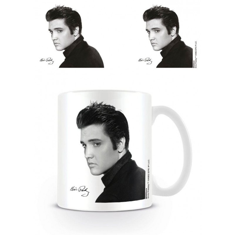 Ce mug élégant en céramique présente un portrait en noir et blanc d'Elvis Presley, capturant son style et sa présence emblématiques. Fabriqué à partir de matériaux de haute qualité, ce mug sous licence officielle a une capacité de 0,315 litres, parfait pour déguster vos boissons préférées tout en rendant hommage au roi du rock and roll.