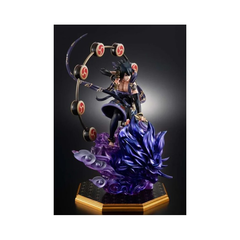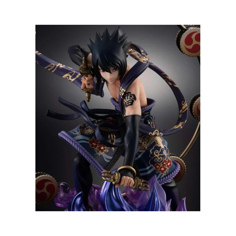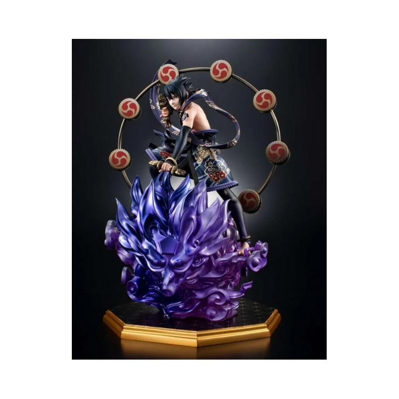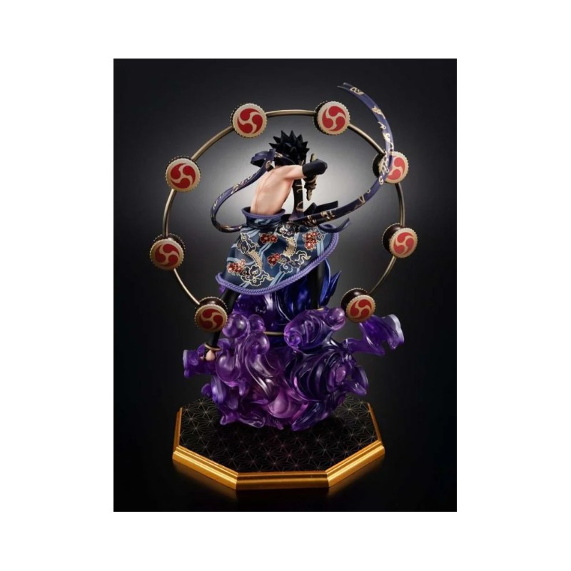 Cette impressionnante figurine de Sasuke tirée de Naruto Shippuden, fabriquée par Megahouse, fait partie de la prestigieuse GEM SERIES. Mesurant environ 28 cm, cette pièce représente Sasuke dans une version alternative comme Dieu du Tonnerre, mettant en valeur la qualité des détails et des finitions. La figurine présente Sasuke dans une pose dynamique entourée d'effets visuels violets qui simulent l'énergie, avec un fond de cercles décoratifs. Officiellement licenciée, cette figurine est parfaite pour les collectionneurs et les fans de Naruto recherchant un article original et exclusif.