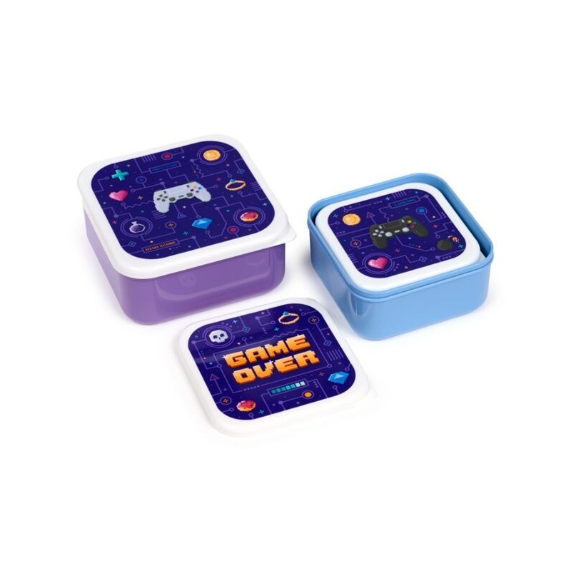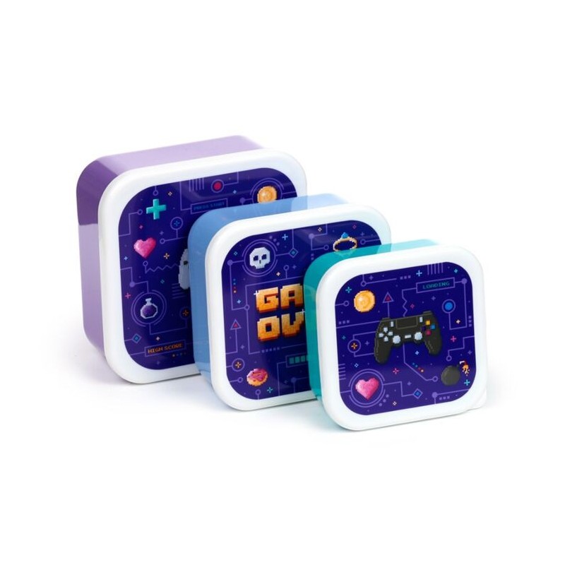 Découvrez l'ensemble de 3 boîtes à lunch 'Game Over', un choix idéal pour les fans de jeux vidéo rétro. Chaque boîte présente un design unique de style arcade avec des couleurs vibrantes comme le violet, le bleu et le vert. Les couvercles sont décorés d'images emblématiques de jeux, telles que des manettes et des éléments pixelisés, ajoutant une touche nostalgique à vos déjeuners.