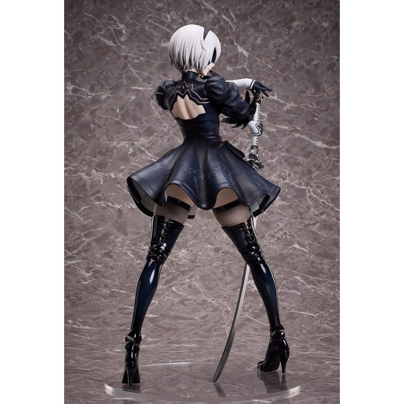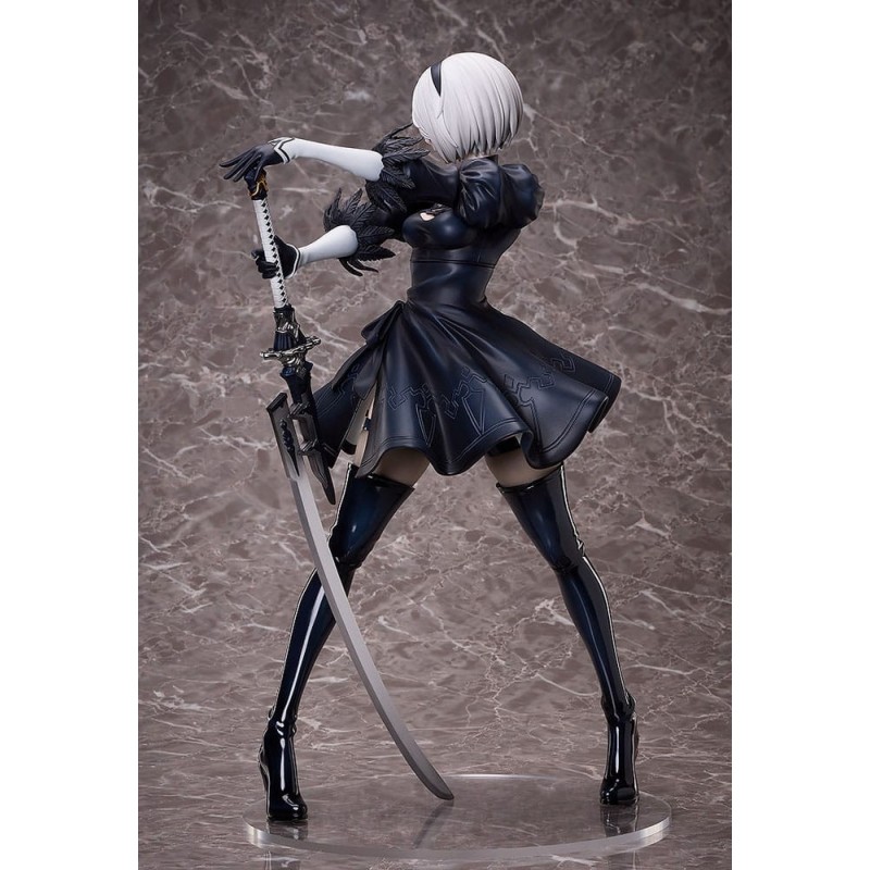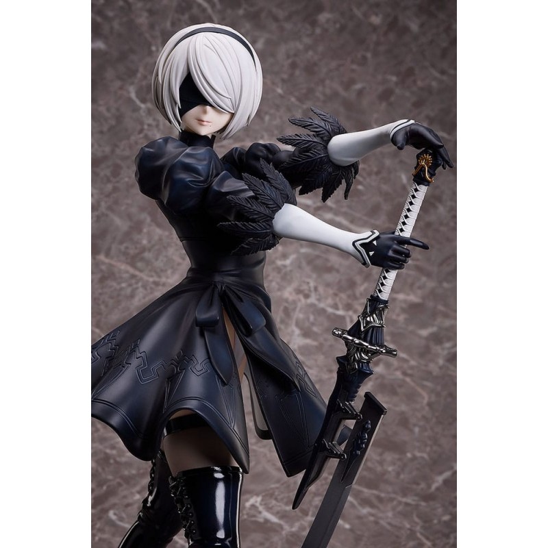 La figurine présente YoRHa No.2 Type B brandissant une épée avec grâce, soulignant sa posture élégante et confiante. Ses longues bottes ajustées et ses gants blancs complètent le design sophistiqué du personnage, tandis que son regard caché sous le bandeau iconique ajoute une aura de mystère.