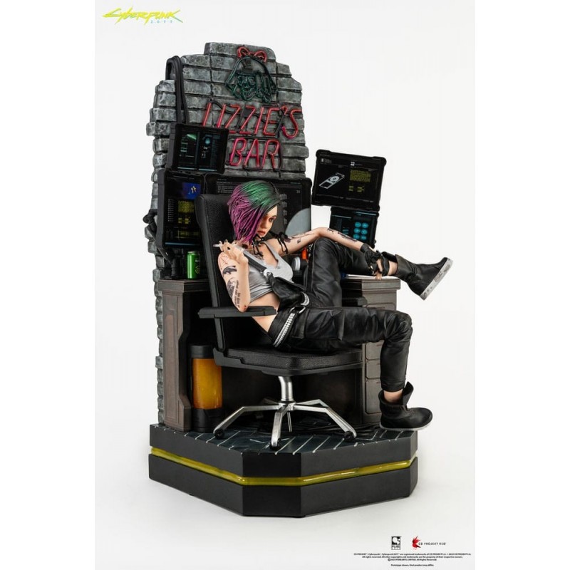 Découvrez l’exquise statue de Judy Alvarez du célèbre jeu Cyberpunk 2077. Mesurant 51 cm de haut, cette figurine à l’échelle 1/4 est fabriquée en polyrésine de haute qualité. Judy est représentée de manière décontractée avec des détails méticuleux, y compris chaque tatouage et élément de tenue, devant une réplique vivante du bar emblématique Lizzie’s, avec un signe néon éclairé par des lumières LED intégrées.