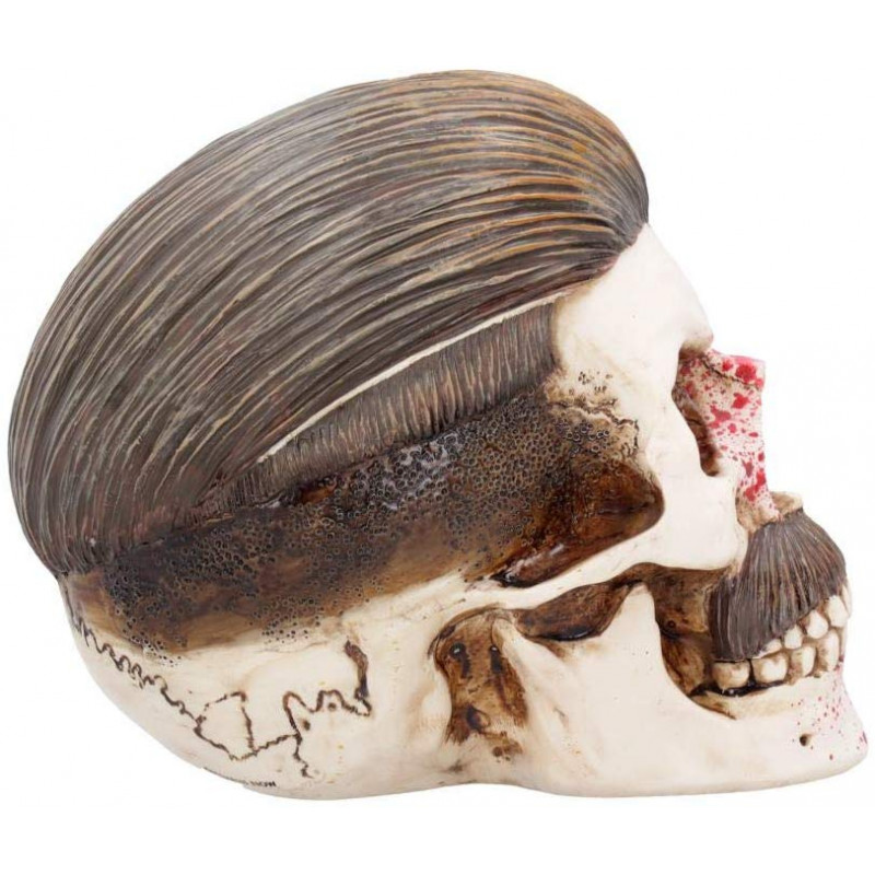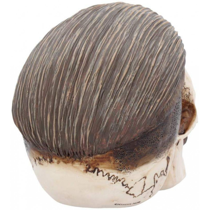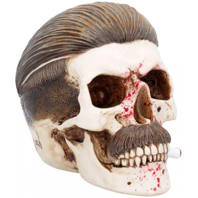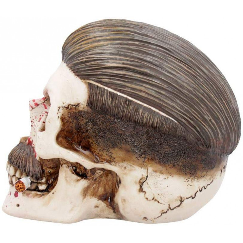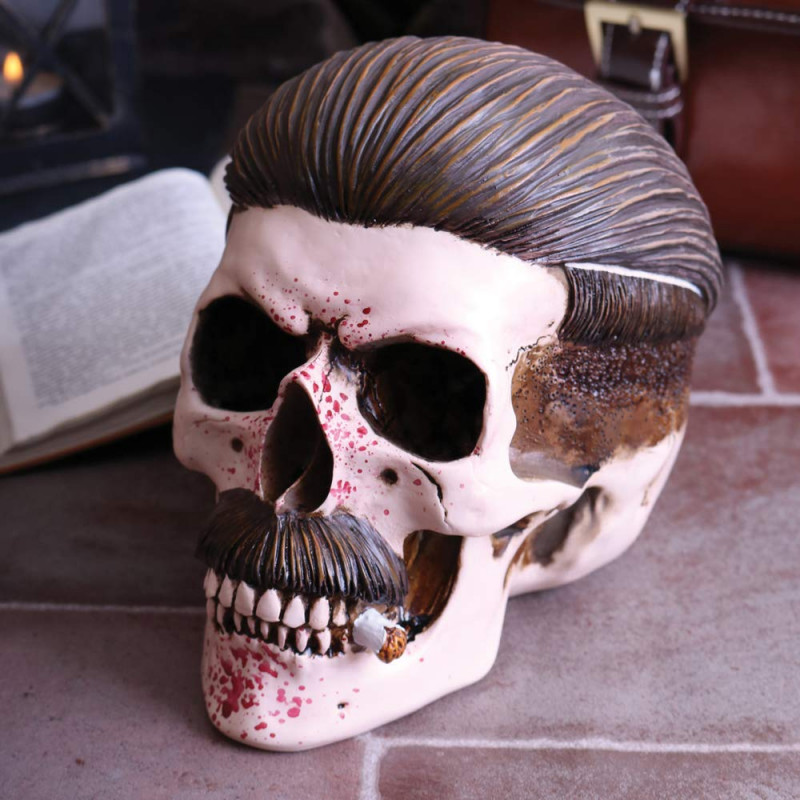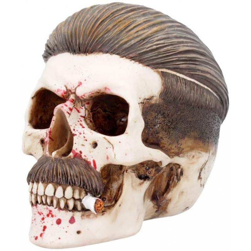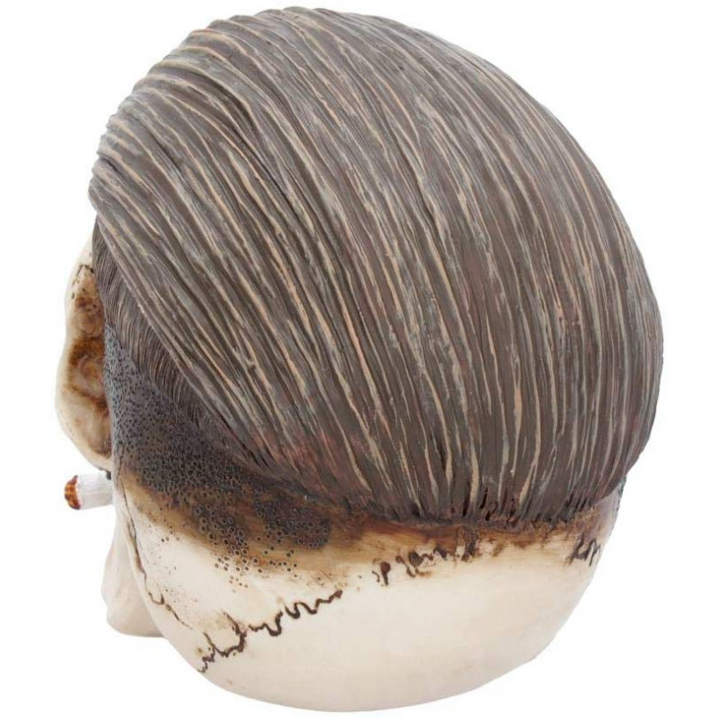 C'est un morceau plein de détails, conçu et fabriqué par la prestigieuse firme de Nemesis, dans la résine de la meilleure qualité, peinte à la main avec soin, y compris ses éclaboussures de sang. Ce crâne mesure environ 18 cm environ, et a un très esthétique particulière, avec la cigarette dans la bouche, les cheveux lissés vers l'arrière et une expression de mauvaise puces tourmenté Arthur Shelby nous avons eu acostrumbrados à voir dans la superbe série britannique Peaky Oeillères