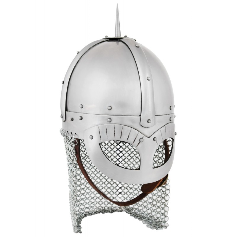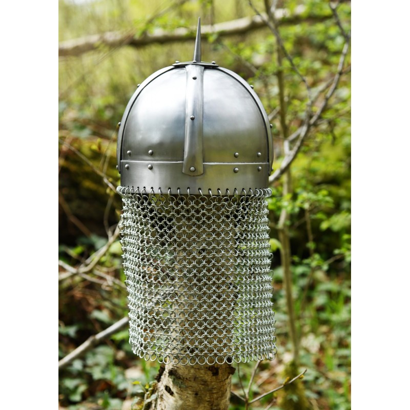 Pesant environ 3,2 kg, il est conçu pour s'adapter à un tour de tête allant jusqu'à 62 cm, avec des dimensions spécifiques incluant 23 cm de l'avant à l'arrière et 20 cm d'un côté à l'autre. L'inclusion d'un aventail en mailles fournit une protection supplémentaire, tandis que la pointe supérieure et les rivets soigneusement placés accentuent son style historique.