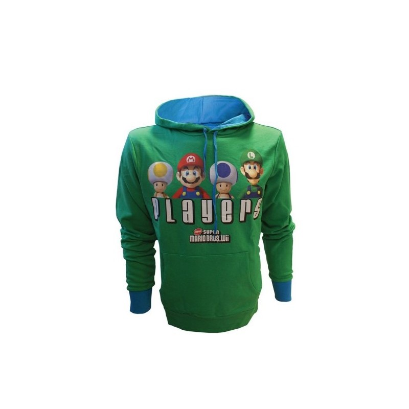 Sweat-shirt vert avec des touches de bleu sur la capuche et les poignets, a l'avant, quatre personnages que vous pouvez choisir de jouer à la Super Mario, Ce que vous allez choisir?