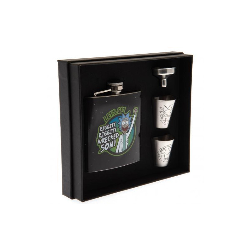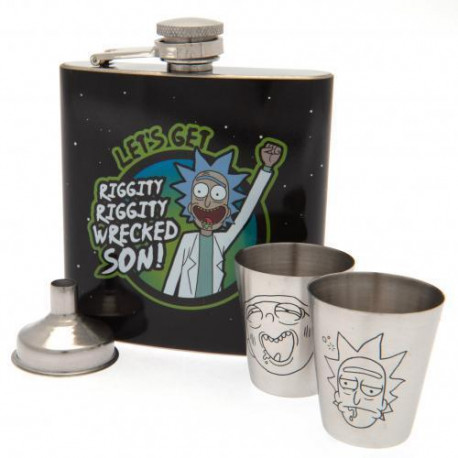 C'est un pack élégant, présenté dans une boîte conçue pour l'occasion, qui se compose d'un petit entonnoir, deux verres, et un hip fiole d'acier inoxydable de la meilleure qualité et le classique conception, comme l'ensemble de la vie, avec 170 cl de capacité, et leur bouchon en métal incoorporado, afin de ne pas les fuites même une goutte. Mais ce qui est plus surprenant, c'est son design fantastique, avec le visage de Rick et Morty dans les vaisseaux et Rick poing sur la hanche flacon.
