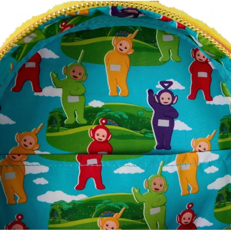 L'intérieur surprend avec une doublure colorée pleine de personnages Teletubbies dans un paysage vert. Le sac à dos dispose de bretelles marron réglables pour le confort et d'une poignée supérieure pour un transport facile. De plus, il est doté d'un détail décoratif en forme de petit disque doré sur le tirette de la fermeture éclair.