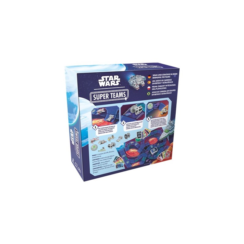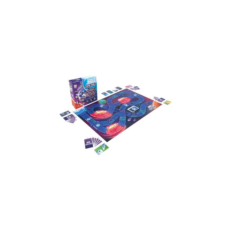 Découvrez le jeu de société Star Wars Super Teams, une aventure intergalactique pour les fans de tous âges. Le jeu est présenté dans une boîte colorée ornée du célèbre Faucon Millenium. À l'intérieur, un plateau vibrant avec des routes spatiales attend, accompagné de vaisseaux célèbres comme les chasseurs TIE et l'Étoile de la Mort pour une véritable expérience de bataille spatiale.