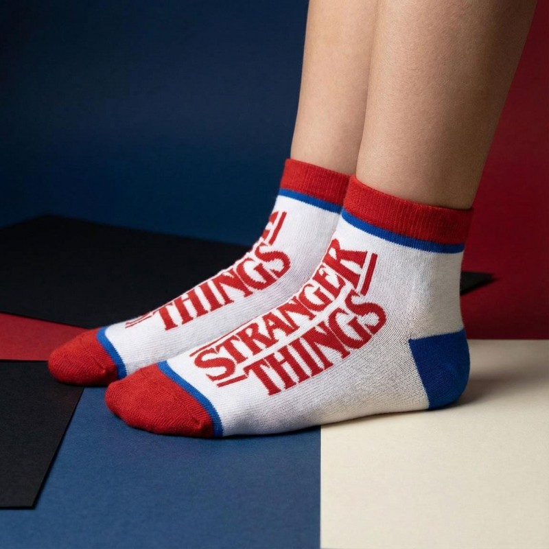 Découvrez le style rétro et le confort avec le Pack de Chaussettes Chevilles Stranger Things. Ce set inclut deux paires de chaussettes inspirées par la série télévisée populaire. Une paire est blanche avec des détails bleus et rouges, mettant en avant le logo Stranger Things sur le côté. L'autre paire est noire, arborant le design emblématique du Démogorgon et le mot 'Monsters' en rouge.