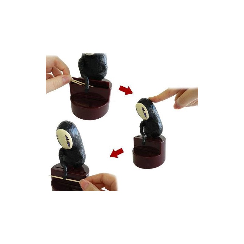 Un distributeur de cure-dents c'est aussi une excellente reproduction de l'un des personnages est certainement plus mystérieux et intéressant dans le monde de la création de Miyazaki. Nous parlons bien sûr de la mythique Sans Visage (ou Kaonashi), le caractère mémorable de l'un de ses chefs-d'œuvre, le voyage de chihiro.
