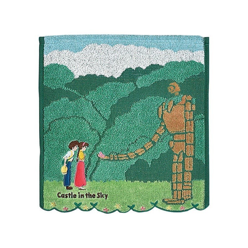 Découvrez la mini serviette inspirée par le film emblématique de Studio Ghibli, Le Château dans le Ciel. Avec des dimensions de 34 x 36 cm, cette pièce est fabriquée en coton de haute qualité à 100 %, garantissant douceur et absorption. Elle présente un design brodé montrant le bien-aimé Robot Soldier dans un cadre vert et luxuriant, capturant l'essence magique du film.