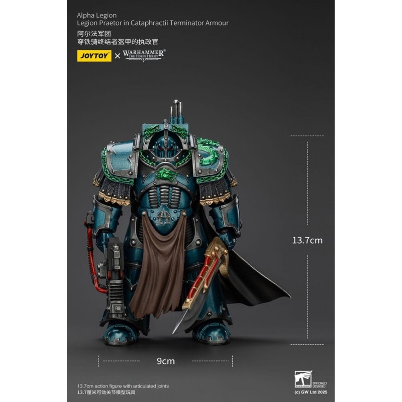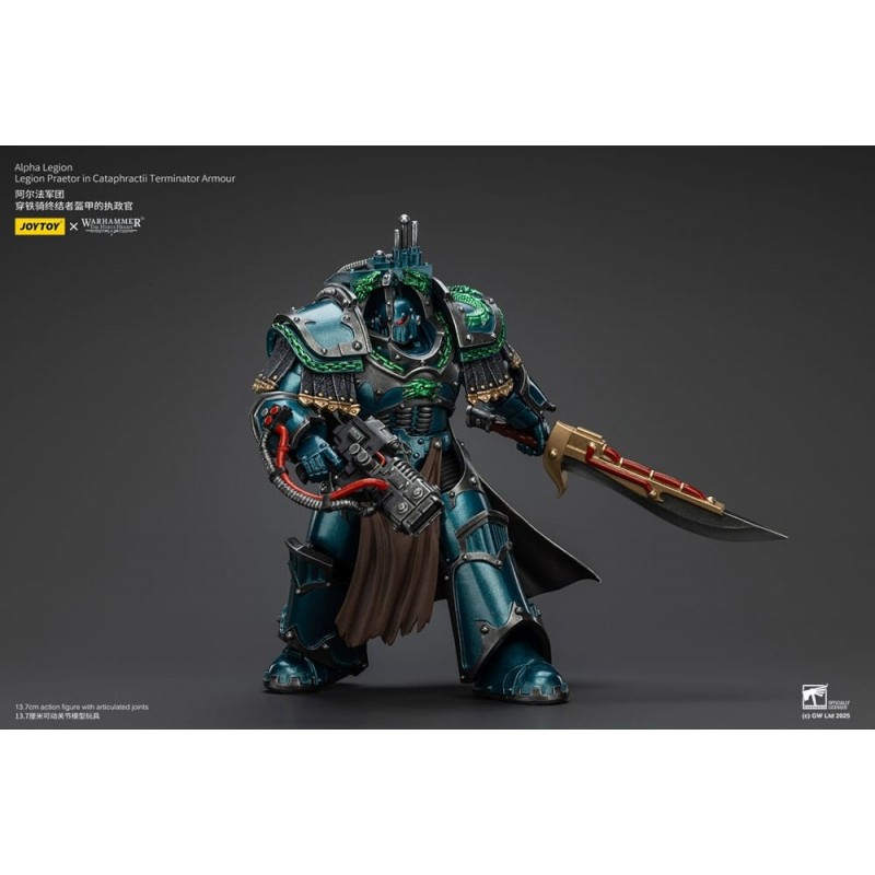 Fabriquée par Joy Toy, elle présente un design complexe avec une armure bleue et verte, ornée de motifs distinctifs de la Légion Alpha. La figurine se distingue par son articulation sophistiquée, permettant des poses dynamiques qui capturent l'essence du Praetor.