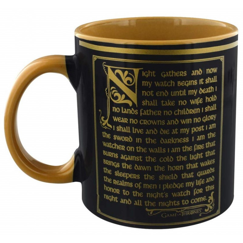 Es una taza oficial de Game of Thrones, realizada en un elegante negro con la inscripción en tonos dorados del juramento que hacen los hombres que defienden el muro, la mítica Night's Watch o Guardia de la Noche. Además, es una taza con un diseño que también abarca su interior, que también es en color dorado, a juego con los dibujos del exterior.