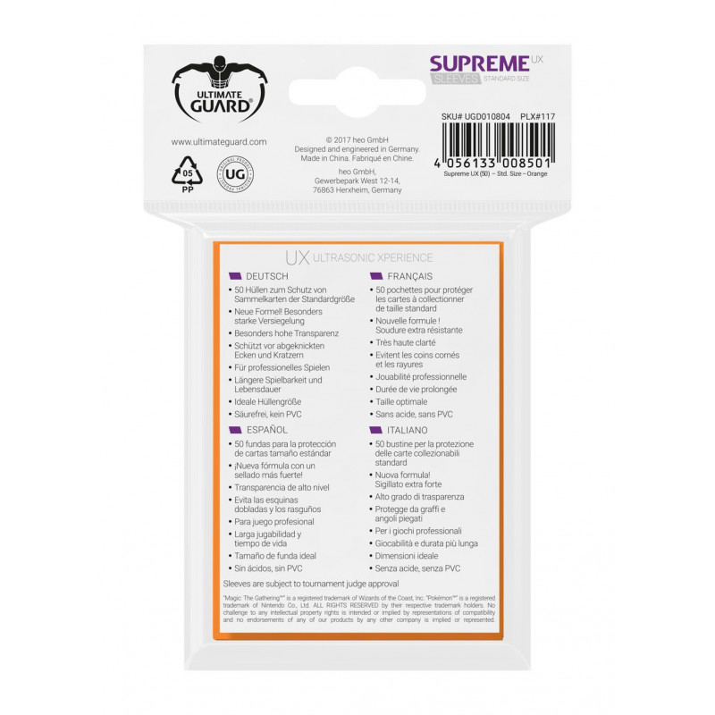 Se trata de un pack con 50 fundas supreme de tamaño estándar (66 x 91 cm), perfecto para la mayoría dejuegos de cartas como Pokemon o Magic. Están fabricadas y diseñadas por la firma Ultimate Guard, con una alta transparencia, sin ácidos ni PVC, para un almacenaje seguro y durabilidad mayor, evitando esquinas dobladas y rasguños. Unas fundas de la gama Supreme, diseñadas para obtener una jugabilidad profesional, con acabados mates no reflectantes y en un color naranja genial.