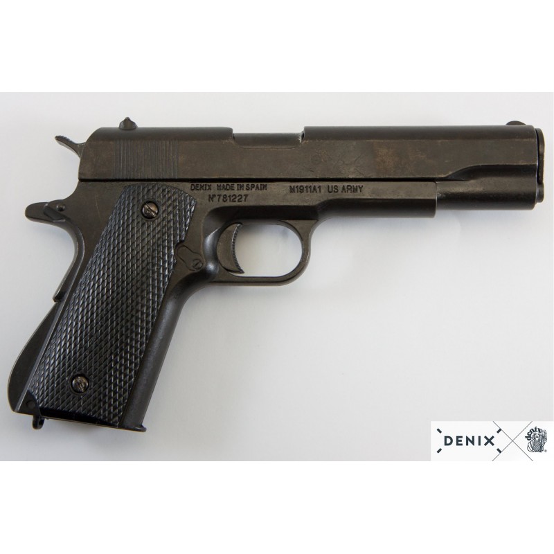 Descubra a réplica perfeita da icônica pistola M1911A1, um símbolo das forças armadas dos EUA durante o século XX. Esta reprodução de Denix é cuidadosamente elaborada em metal, com empunhaduras de plástico preto que imitam a textura original. Com um mecanismo que simula carregamento e disparo, é ideal para entusiastas da história militar. Mede 24 cm e pesa 824 g, sendo confortável para exibir ou usar em recriações históricas.