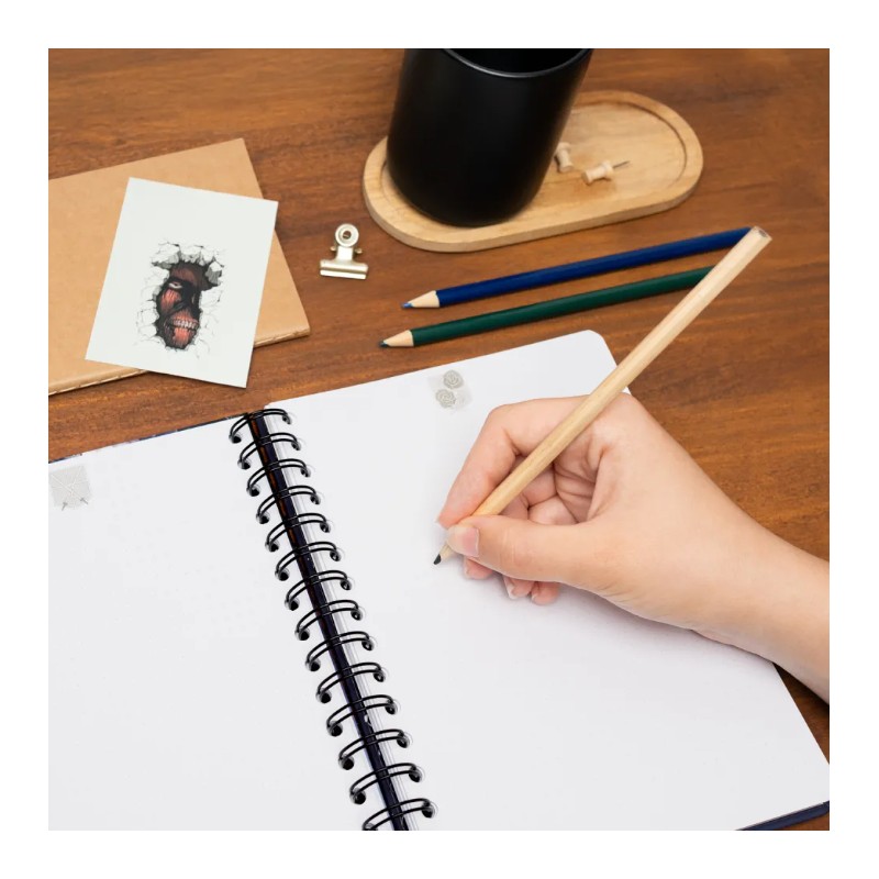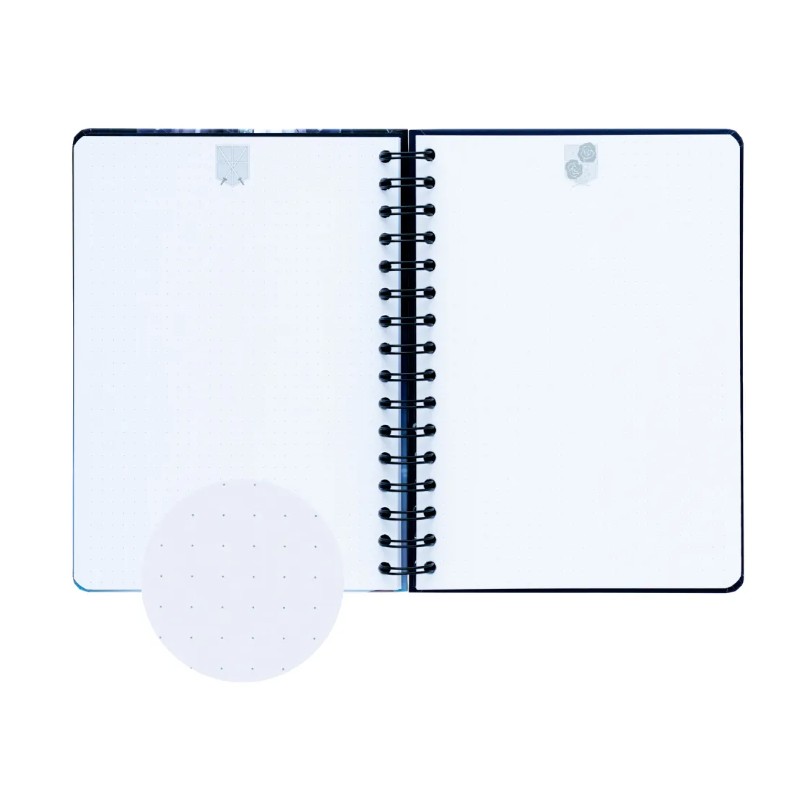 Este caderno de capa dura A5 captura a essência de Attack on Titan com uma impressionante capa laminada mate. Projetado para verdadeiros fãs, seu interior estilo bullet é perfeito para notas criativas e organizadas. Os cantos arredondados e a encadernação tipo wire-o garantem conforto e durabilidade. Inclui um bolso prático e um fecho com banda elástica para maior segurança. Desfrute de 90 folhas (180 páginas) de 100 g/m2, ideais para escrever sem que a tinta atravesse. Um produto com licença oficial, perfeito para presentear ou se mimar.