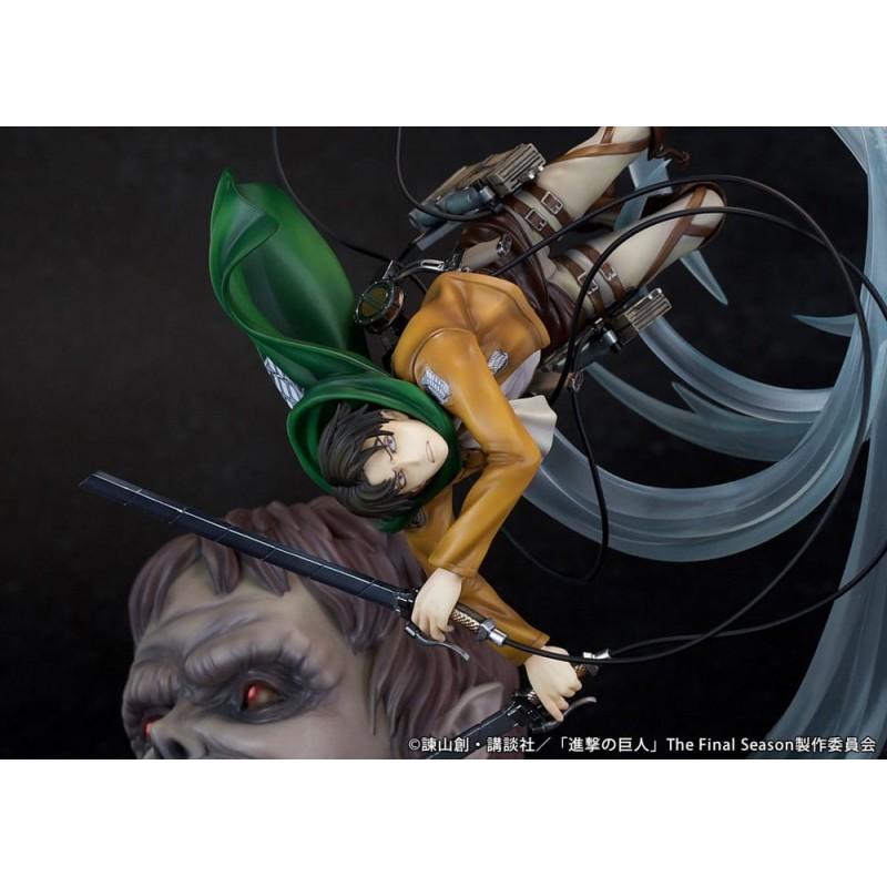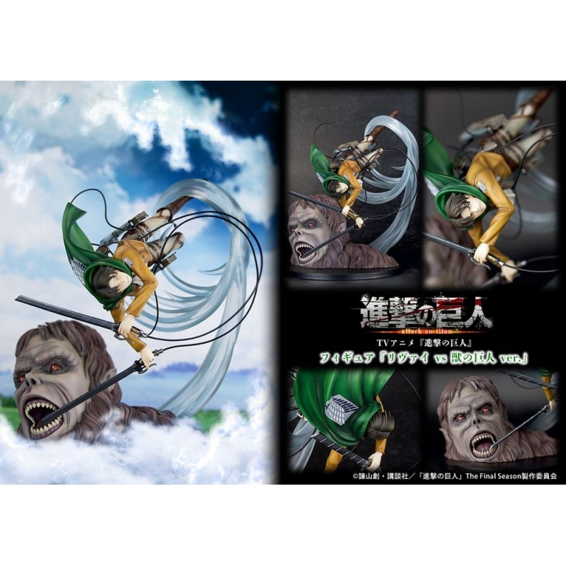 A figura mostra Levi em uma posição de batalha intensiva, com seu característico equipamento de manobra tridimensional e capa verde esvoaçante, enfrentando o monumental Beast Titan, cujo rosto é mostrado com detalhes expressivos e surpreendentes. Um item indispensável para os verdadeiros entusiastas de manga e anime!