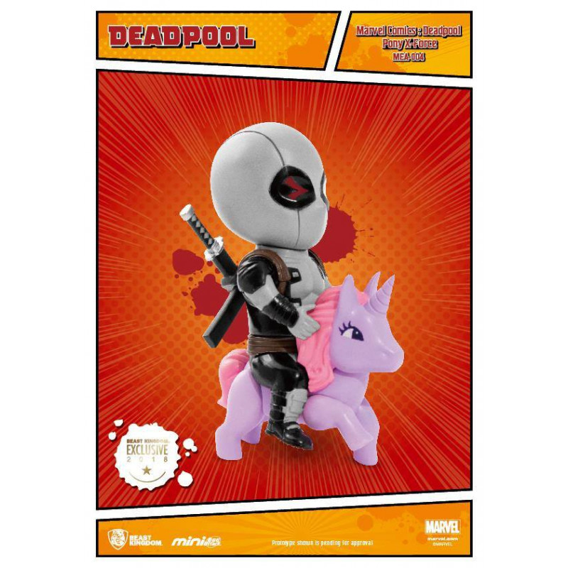 En esta ocasión nos traen a uno de los personajes más reconocibles y emblemáticos de Marvel y los comics en general, el mítico Deadpool, pero en este caso en una de sus poses más gamberras a lomos de un Unicornio rosa y con su traje gris. Cuenta además con una peana cuyo diseño está hecho especialmente para él.