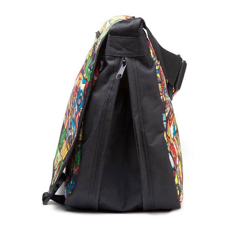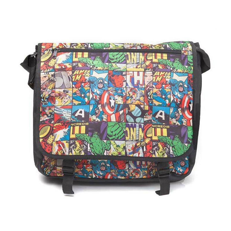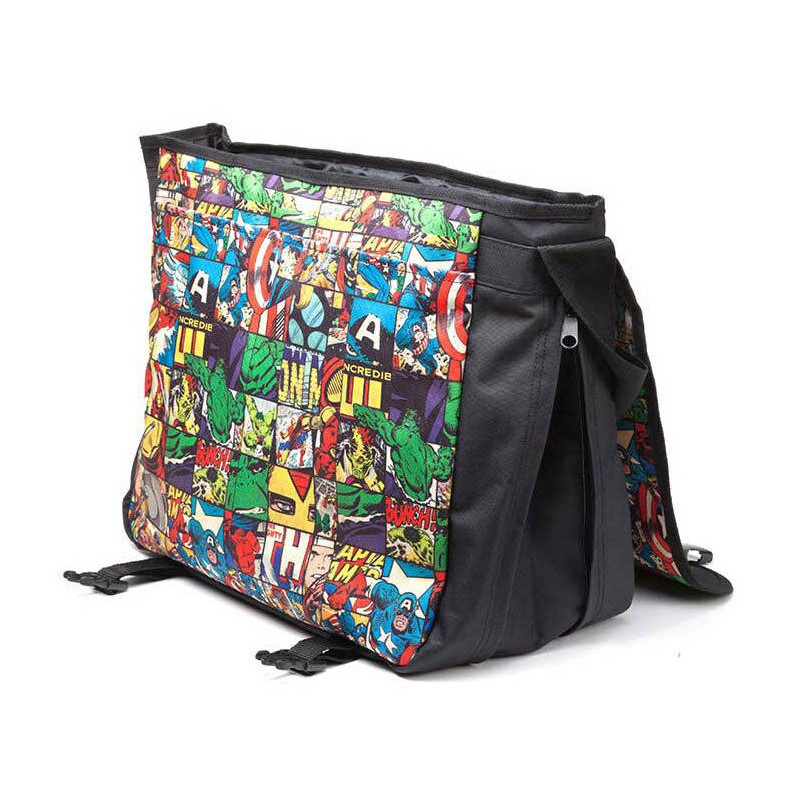 Tiene un diseño realmente genial, con un colorido mosaico en que vemos a algunos de los personajes más icónicos de Marvel, tal y como aparecieron en los cómics originales: Capitán América, Hulk, Iron Man,Thor... Cuenta con correa ajustable, varios compartimentos cerrados con cremallera y un tamaño realmente magnífico, mide aproximadamente 42 x 35 cm. Además, está realizada sin la utilización de piezas o componentes de origen animal, en poliéster reforzado de gran calidad.