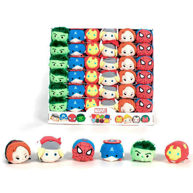Una adorable serie de peluches sorpresa, estilo Tsum - tsum, expresión japonesa que significa literalmente "amontonado" y define perfectamente a esta colección de peluches apilables basados enalgunos de los héroes más famosos de Marvel y Avengers.