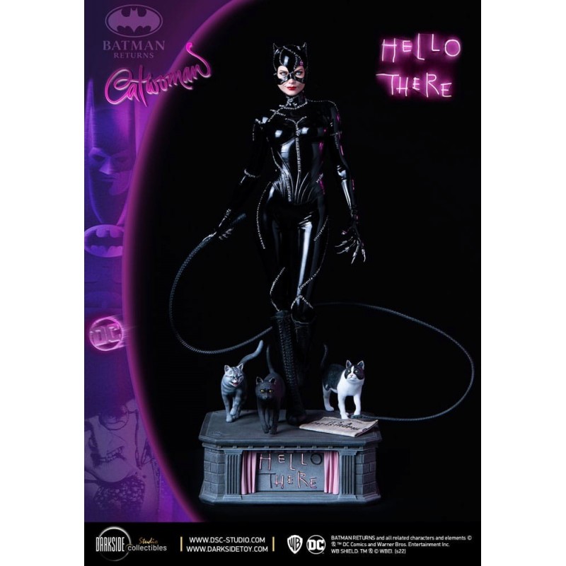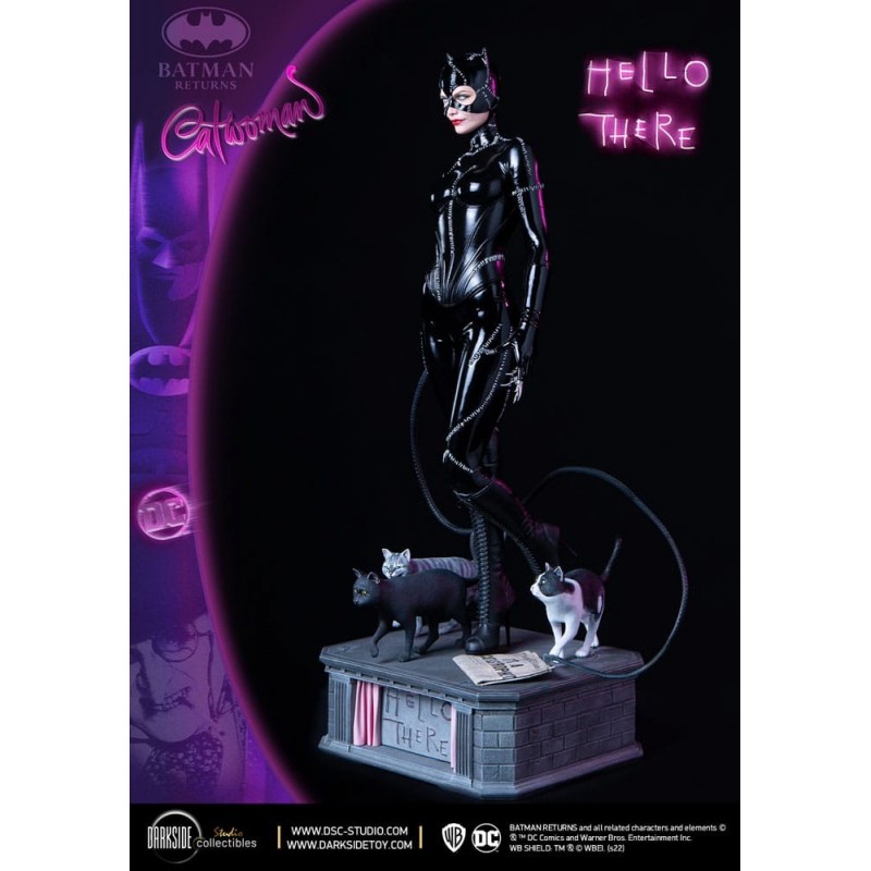 Explore a elegância e o poder de Catwoman com esta impressionante estátua de poliresina de 54 cm da Darkside Collectibles Studio. Celebrando o 30º aniversário de Batman Returns, este modelo é um tributo excepcional a um dos personagens mais icônicos de DC Comics. Cada peça é finalizada e pintada à mão com perfeição, retratando Catwoman em seu traje preto brilhante com um chicote na mão, rodeada de gatos, sobre uma base personalizada com a inscrição "Hello There".