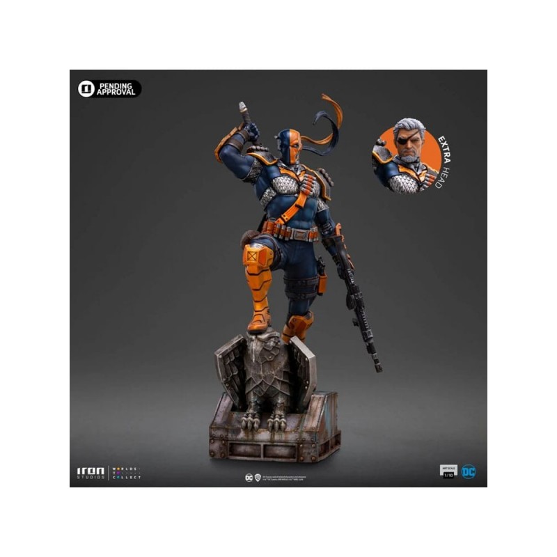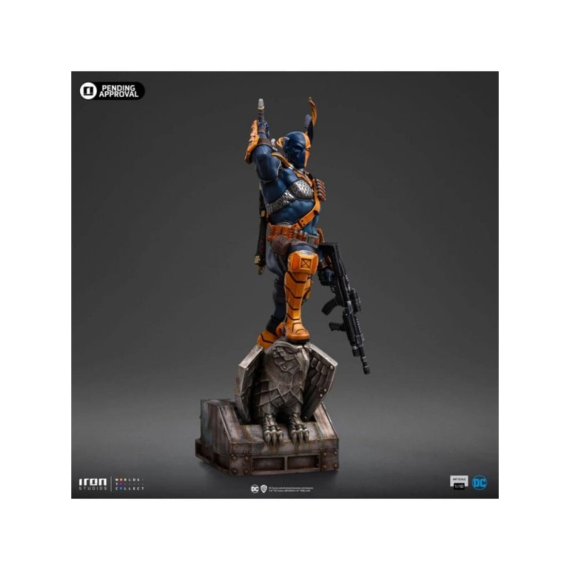 Esta impressionante estátua do Deathstroke da Iron Studios é um item essencial para qualquer colecionador de DC Comics. Feita de polirresina, apresenta detalhes meticulosos em um acabamento que destaca sua presença imponente. A figura de 26 cm é exibida em uma combinação vibrante de azul e laranja, acentuando seus acessórios de combate. Sua postura dinâmica em uma base temática com águia adiciona um toque de drama e heroísmo, perfeito para exibição.