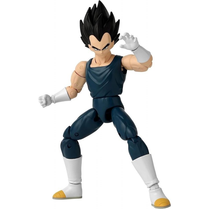 Descubra a figura de Vegeta da série Dragon Ball Dragon Stars. Esta figura colecionável da Bandai tem 17 cm de altura e é feita com precisão, capturando cada detalhe do personagem. Ele veste seu traje escuro característico com botas e luvas brancas, e seu penteado espetado é inconfundível.