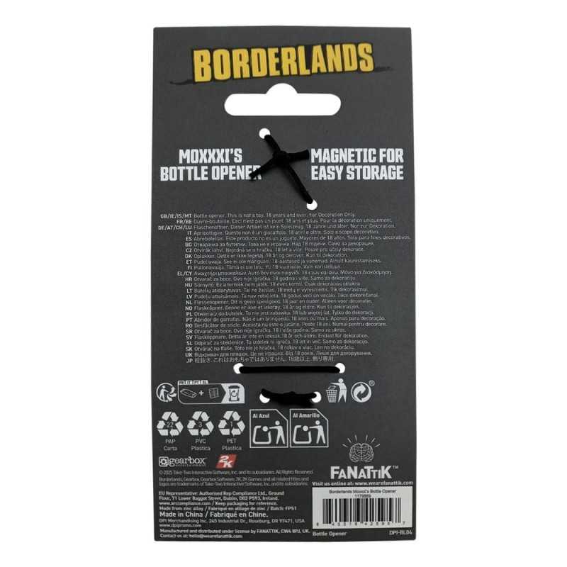 Perfeito como presente ou para uso pessoal, este abridor de garrafas também conta com um imã para fácil armazenamento e exibição em qualquer superfície metálica. Sua construção robusta garante durabilidade, enquanto seu design encanta os seguidores de Borderlands.
