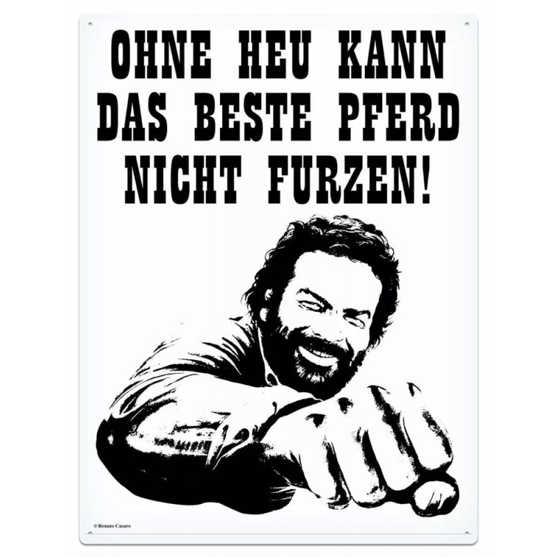 Descubra a placa de metal Bud Spencer, um item decorativo essencial para qualquer fã deste ator icônico. Medindo 30 x 40 cm, esta placa de metal apresenta uma ilustração em preto e branco de Bud Spencer com seu gesto amigável característico. No topo, a frase humorística em alemão "Ohne Heu kann das beste Pferd nicht furzen!" adiciona originalidade e humor.
