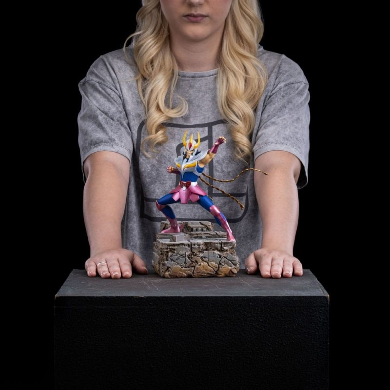 Descubra essa impressionante estátua de Phoenix Ikki de Saint Seiya, criada pela Iron Studios. Projetada em escala 1/10, essa figura colecionável mede aproximadamente 23 cm de altura, 18 cm de largura e 14 cm de profundidade. Feita de poliresina de alta qualidade, captura em detalhe o dinamismo e a essência do personagem, das cores vibrantes de sua armadura azul e rosa à expressão decidida em seu rosto. A pose heroica sobre uma base que recria um terreno rochoso adiciona um contexto épico a qualquer coleção. Como produto oficial licenciado, é um presente ideal para os fãs dos Cavaleiros do Zodíaco.