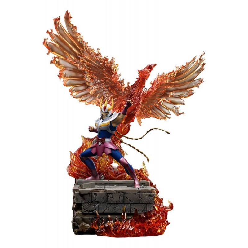 A estátua de Phoenix Ikki de Saint Seiya é um item de colecionador indispensável para os fãs da série. Fabricada por Iron Studios, esta figura em escala 1/10 tem aproximadamente 41 cm de altura e é confeccionada em polirresina de alta qualidade. Sua característica mais impressionante é a notável representação da fênix com asas abertas, parecendo emergir em uma explosão de chamas, complementada por uma base rochosa com detalhes de fogo realistas.