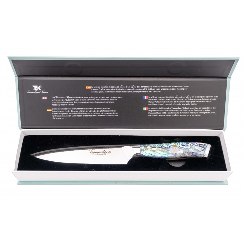 O cabo, feito de Abalone com epóxi, oferece não só resistência, mas também um design visualmente marcante com tons iridescentes que captam a luz de uma forma única. A faca pesa 101 gramas e a sua estrutura equilibrada facilita o seu manuseamento, tornando-a imprescindível para chefes profissionais e amadores exigentes.
