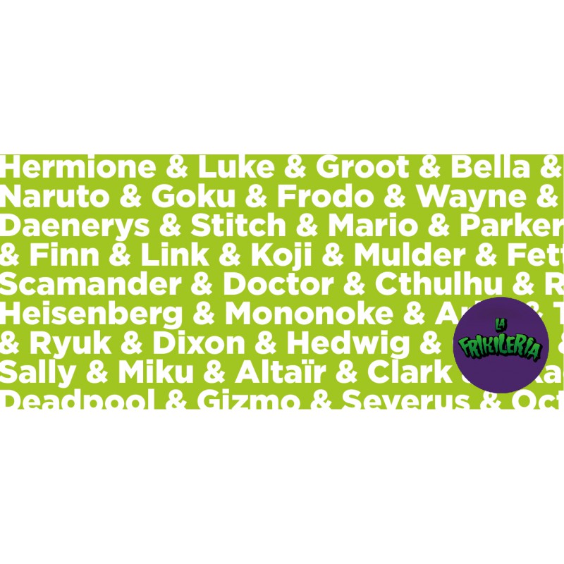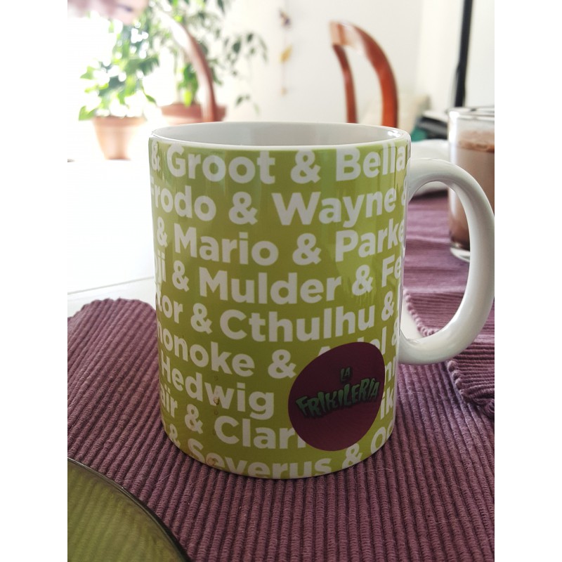 Desde La Frikilería hemos creado esta taza muy especial con los nombres de quienes nos gustaría que nos acompañen a tomar el café mañanero cada día: Hermione, Luke, Groot, Bella, Naruto, Goku, Frodo, Wayne, Daenerys, Stitch, Mario, Parker, Finn, Link, Koji, Mulder, Fett, Scamander, Doctor, Cthulhu, Heisenberg, Mononoke, Ariel, Ryuk, Dixon, Hedwig, Quinn, Sally, Miku, Altaïr, Clark, Pikachu, Deadpool, Gizmo, Severus...