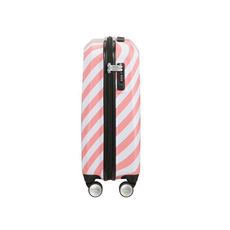 Mide aproximadamente 55 x 40 x 20 cm, para que puedas meter unas cuantas cosas pero a la vez llevarla contigo en al avión, ya que cumple con las medidas del equipaje de cabina. Es una maleta tipo trolley que cuenta con cuatro ruedas dobles y asa telescópica. Su exterior es rígido con materiales de nueva generación que absorben los impactos, para que no se estropee nada dentro. Ha sido diseñada y fabricada por la prestigiosa firma American Tourister (grupo Samsonite).