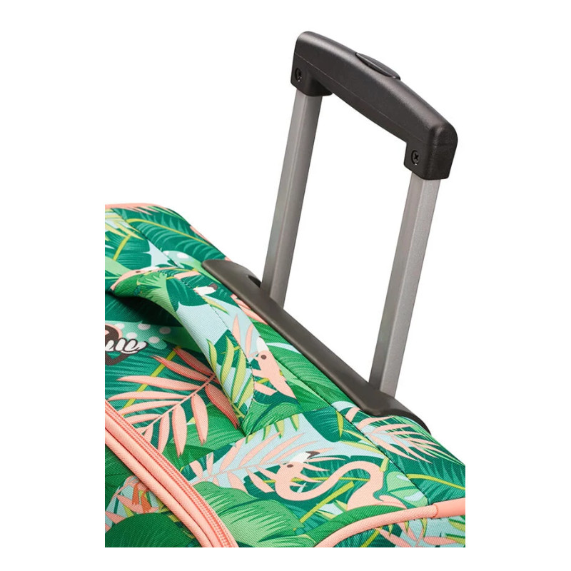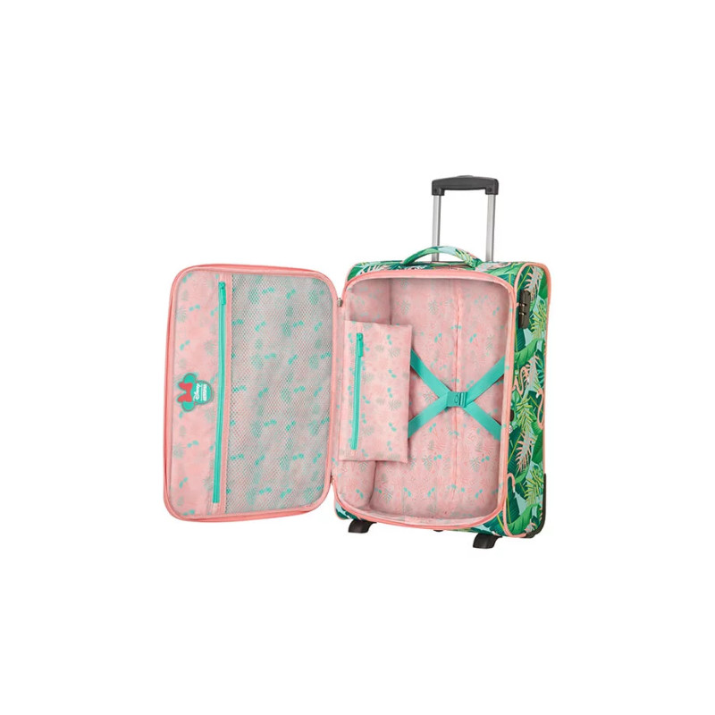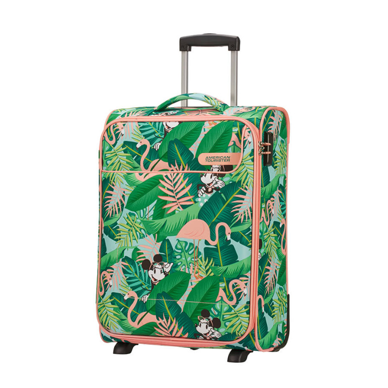 Y su diseño es genial: protagonizado por la siempre elegante Minnie Mouse, camuflada en un estampado muy fresco, lleno de hojas, flamencos y con la Minnie más veraniega. Tiene un gran compartimento principal que dispone de cierre de seguridad con tres dígitos, y un separador interior de bolsillo con rejilla.