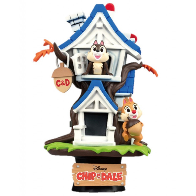 En esta ocasión, tenemos un conjunto de Chip y Chop, de unos 15 cm, con unas figuras llenas de detalles, agrupadas en torno a un diorama, que es una reproducción de la casa de estas dos ardillas tan divertidas. Una figura que reproduce muy bien esta casita árbol que es una monada, y además en la base aparece el logo oficial de Chip y Chop, con su título original: Chip & Dale.