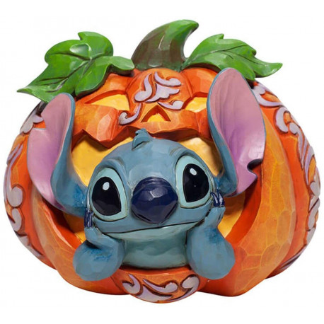 En esta ocasión, tenemos una preciosidad de figura de uno de los personajes más divertidos y adorables de Disney, Stitch, metido dentro de una calabaza. Tiene todos los detallitos característicos de Stitch reproducidos minuciosamente, además de los propios de Jim Shore. Mide aproximadamente 13,5 x 16 x 10 cm.